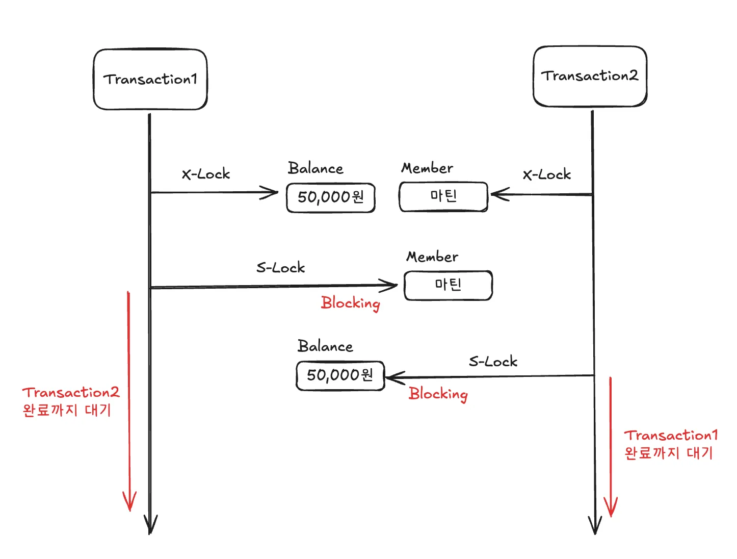 트랜잭션1은 Balance 테이블에 베타락을 얻었고, 트랜잭션2는 Member 테이블에 베타락을 얻었다. 트랜잭션1은 Member 테이블에 공유락을 얻길 원하기 때문에 베타락이 걸려있는 Member의 트랜잭션2가 종료되길 기다린다. 동시에 트랜잭션2는 Balance 테이블에 공유락을 얻길 원하기 때문에 베타락이 걸려있는 Balance의 트랜잭션1이 종료되길 기다린다. 서로 기다리는 데드락이 발생.